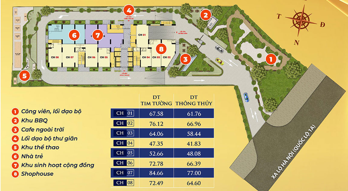 Mật độ xây dựngXây dựng 36,33% còn lại cảnh quan cây xanh và đường giao thông
